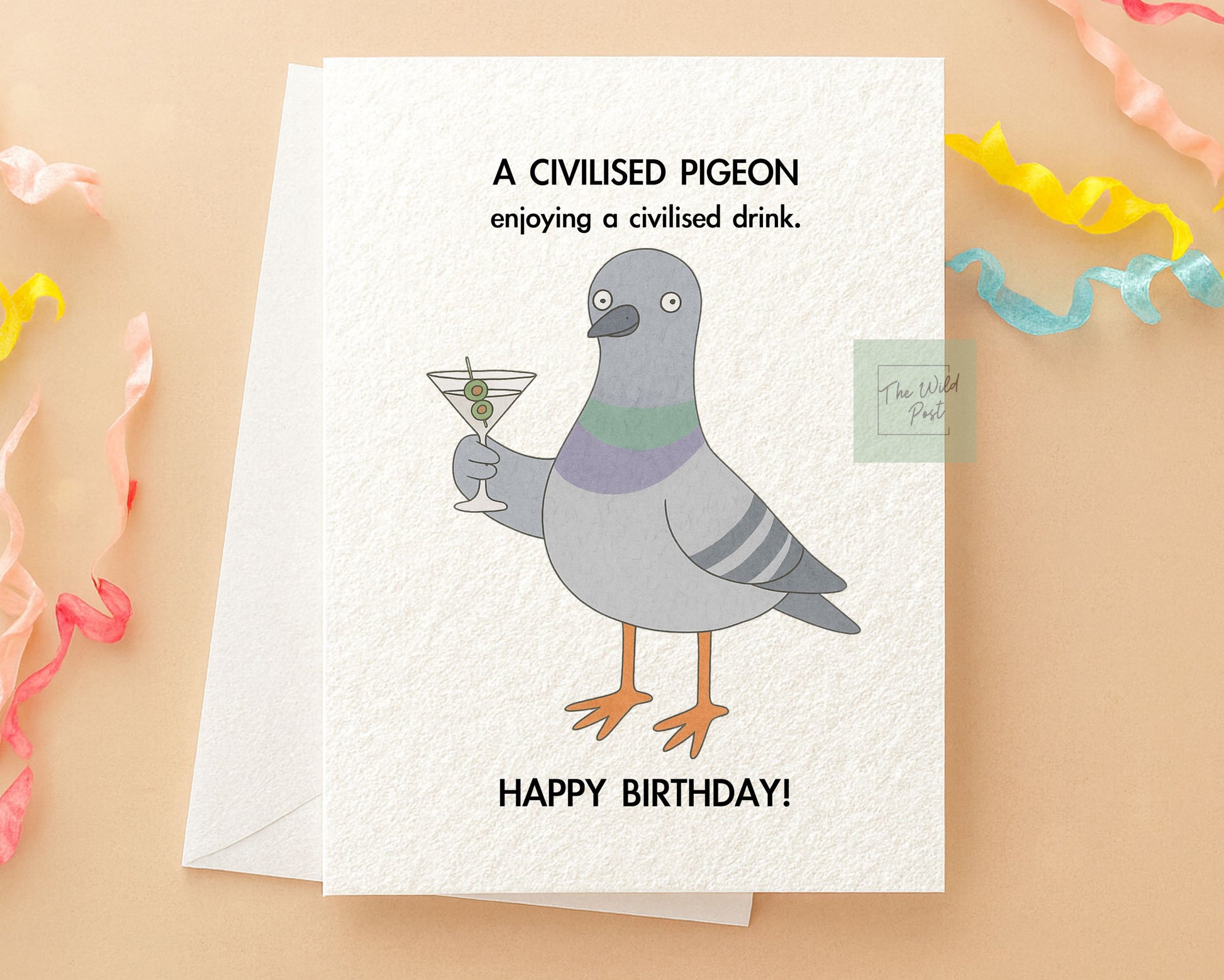 Civilised Pigeon Greeting Card - Happy Birthday - Cute Pigeon - Funny Card For Friend, Martini and Bird Birthday Card