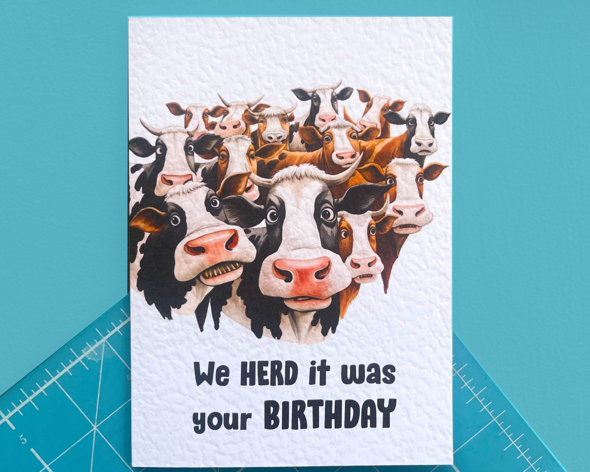 Funny Cow Card, We Herd' It Was Your Birthday, Funny Herd of Cows Drawing - Cute Cows